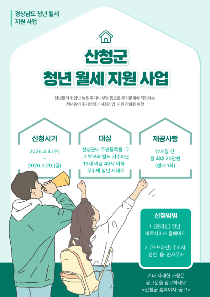 지원 대상은 산청군에 주민등록을 두고 부모와 별도로 거주하는 19세 이상 49세 이하의 무주택 청년 세대주로, 청년 본인소득 기준 중위소득 60% 초과 150% 이하며, 임차보증금 1억원 이하, 월세 60만원 이하인 주택에 거주하는 조건을 충족해야 한다.