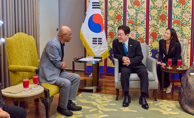 한편 김혜경 여사는 준비한 수박 주스를 권하며 갈락 씨의 건강과 행복을 기원했고, 이 대통령은 갈락 씨와의 인연이 수록돼 있는 '이재명 자서전'을 선물로 건네고 기념 촬영을 진행했다.