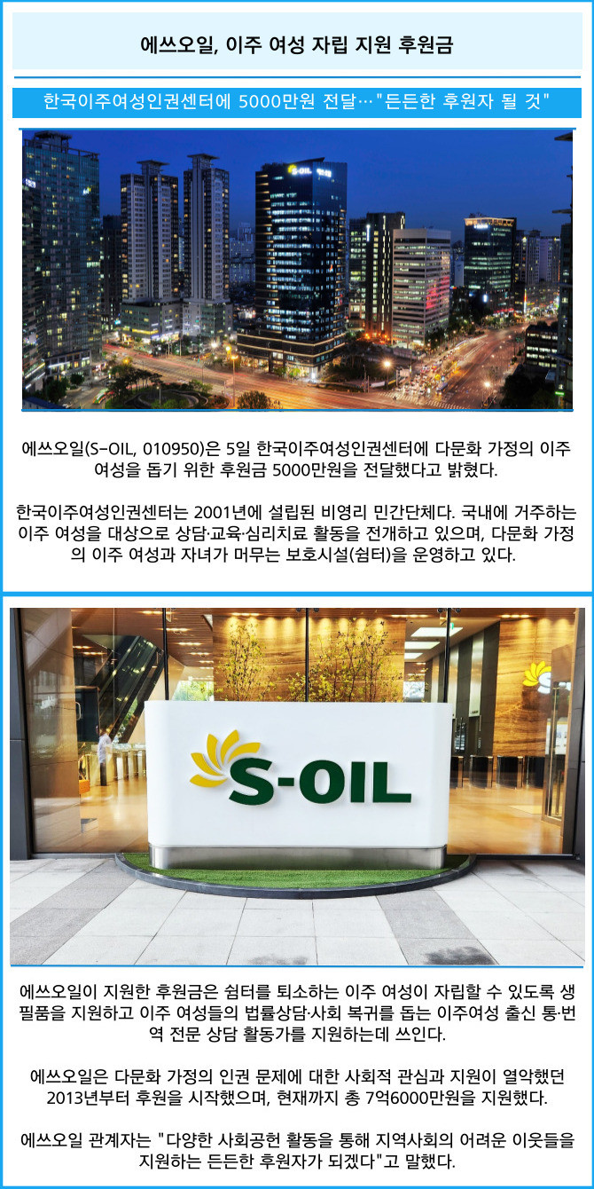 [프라임경제] 에쓰오일(S-OIL, 010950)은 5일 한국이주여성인권센터에 다문화 가정의 이주 여성을 돕기 위한 후원금 5000만원을 전달했다고 밝혔다.
