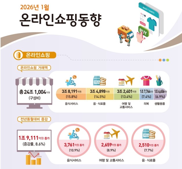 국가데이터처가 5일 발표한 '2026년 1월 온라인쇼핑동향'에 따르면 올해 1월 온라인쇼핑 거래액은 24조1004억원으로 전년 동월 대비 8.6%(1조9111억원) 증가했다.
