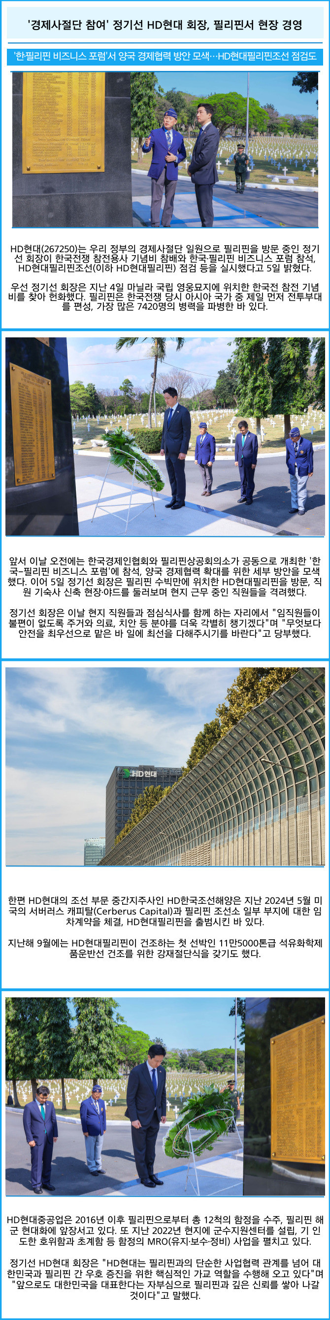 [프라임경제] HD현대(267250)는 우리 정부의 경제사절단 일원으로 필리핀을 방문 중인 정기선 회장이 한국전쟁 참전용사 기념비 참배와 한국·필리핀 비즈니스 포럼 참석, HD현대필리핀조선(이하 HD현대필리핀) 점검 등을 실시했다고 5일 밝혔다.