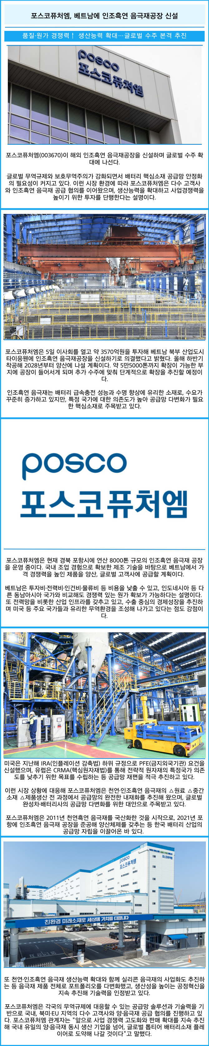 [카드] 포스코퓨처엠, 베트남에 인조흑연 음극재공장 신설