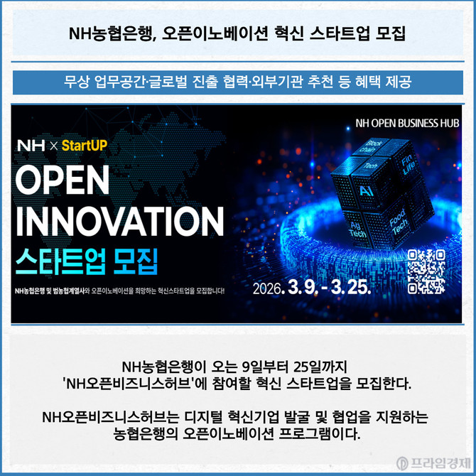 [프라임경제] NH농협은행이 오는 9일부터 25일까지 'NH오픈비즈니스허브'에 참여할 혁신 스타트업을 모집한다.