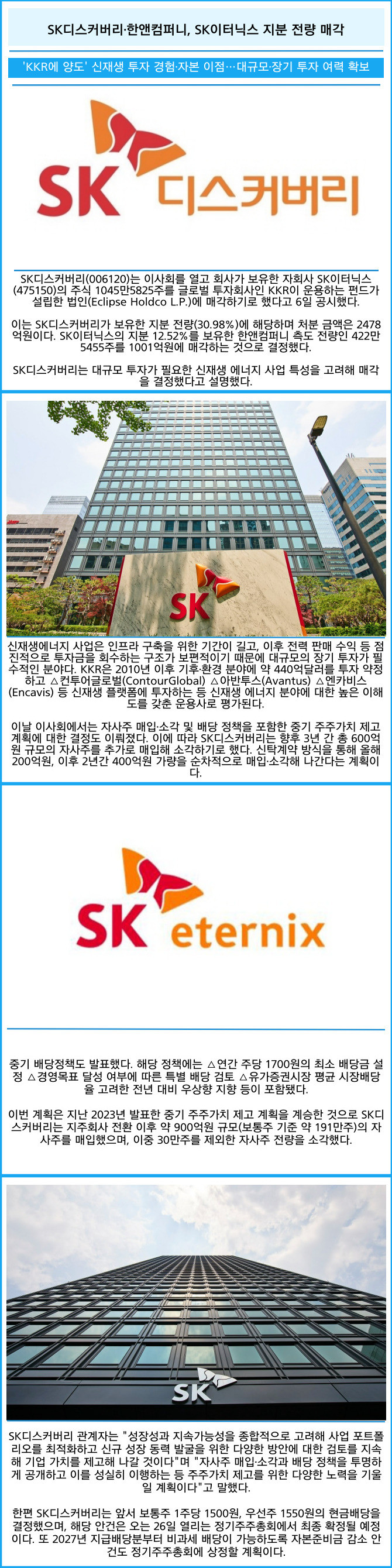 [프라임경제] SK디스커버리(006120)는 이사회를 열고 회사가 보유한 자회사 SK이터닉스(475150)의 주식 1045만5825주를 글로벌 투자회사인 KKR이 운용하는 펀드가 설립한 법인(Eclipse Holdco L.P.)에 매각하기로 했다고 6일 공시했다.