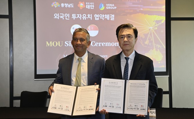 충남도에 따르면, 김 지사는 지난 6일 싱가포르 스위소텔 더 스탬포드 호텔에서 니틴 압테 뷔나그룹 대표와 가세로 태안군수 등이 참석한 가운데 투자 양해각서(MOU)를 체결했다.