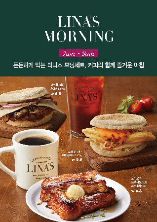 리나스는 오전 7시부터 9시까지 운영하는 모닝 세트 3종도 새롭게 구성했다. '잉글리쉬 머핀 2종(오믈렛 체다 머핀·머쉬룸 머핀)+아메리카노' 세트는 5800원, '브리오슈 프렌치토스트+아메리카노' 세트는 6800원에 판매한다.