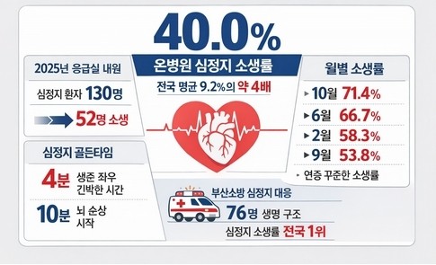 9일 온병원이 발표한 '2025년 지역응급의료센터 심정지 환자 통계'에 따르면 지난해 1월부터 12월까지 심정지 상태로 응급실에 내원한 환자 130명 가운데 52명이 소생했다. 연간 평균 소생률은 40.0%로, 통상 10% 안팎으로 알려진 국내 평균 심정지 생존율과 비교하면 약 4배 높은 수준이다.