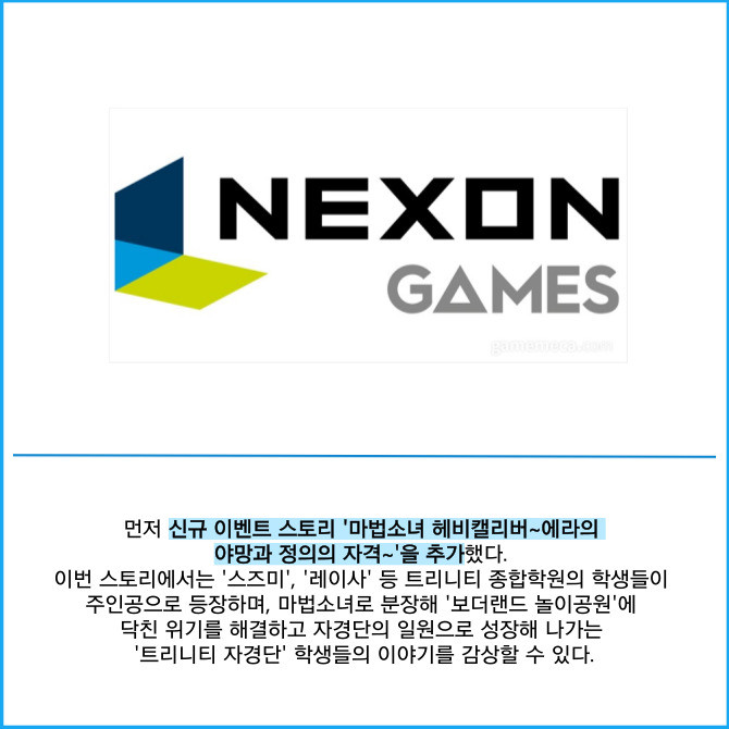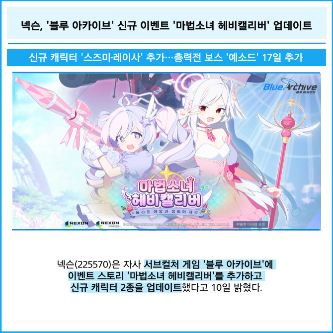[프라임경제] 넥슨(225570)은 자사 서브컬처 게임 '블루 아카이브'에 이벤트 스토리 '마법소녀 헤비캘리버'를 추가하고 신규 캐릭터 2종을 업데이트했다고 10일 밝혔다.