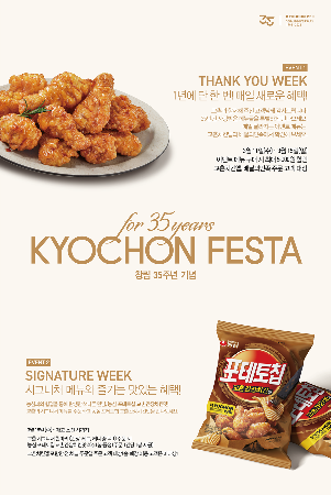 교촌치킨을 운영하는 교촌에프앤비(339770)가 창립 35주년을 맞아 고객 감사 프로모션 '교촌페스타(KYOCHON FESTA)'를 진행한다고 11일 밝혔다.