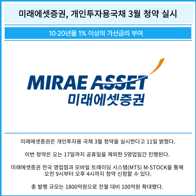 [프라임경제] 미래에셋증권(006800)은 개인투자용 국채 3월 청약을 실시한다고 11일 밝혔다.