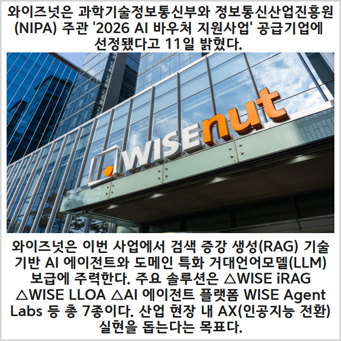 [프라임경제] 와이즈넛(대표 강용성, 096250)은 과학기술정보통신부와 정보통신산업진흥원(NIPA) 주관 '2026 AI 바우처 지원사업' 공급기업에 선정됐다고 11일 밝혔다.