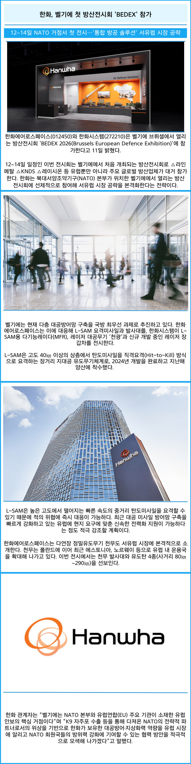 [프라임경제] 한화에어로스페이스(012450)와 한화시스템(272210)은 벨기에 브뤼셀에서 열리는 방산전시회 'BEDEX 2026(Brussels European Defence Exhibition)'에 참가한다고 11일 밝혔다.