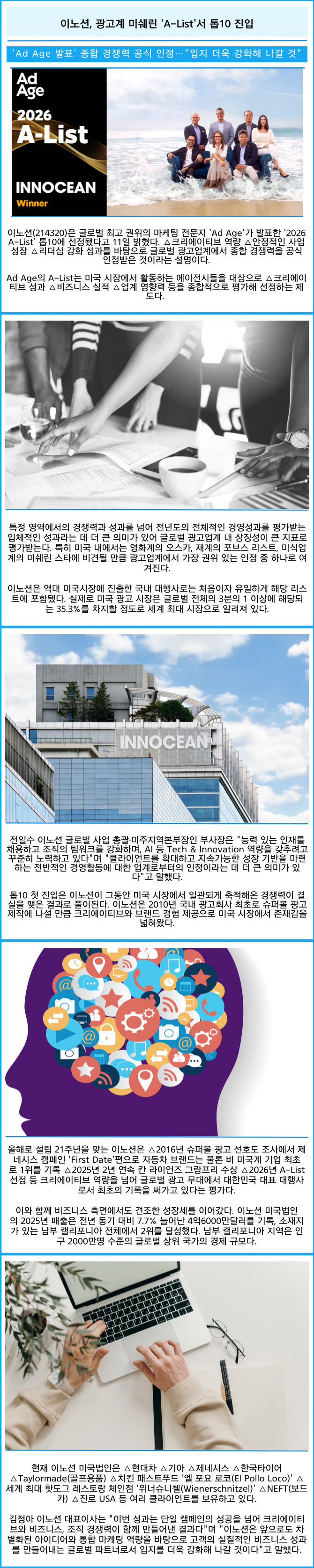 [프라임경제] 이노션(214320)은 글로벌 최고 권위의 마케팅 전문지 'Ad Age'가 발표한 '2026 A-List' 톱10에 선정됐다고 11일 밝혔다. △크리에이티브 역량 △안정적인 사업 성장 △리더십 강화 성과를 바탕으로 글로벌 광고업계에서 종합 경쟁력을 공식 인정받은 것이라는 설명이다.