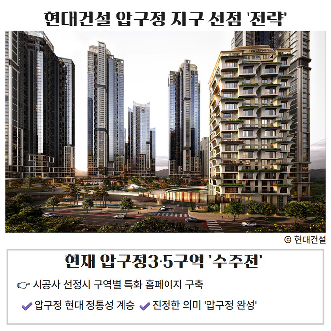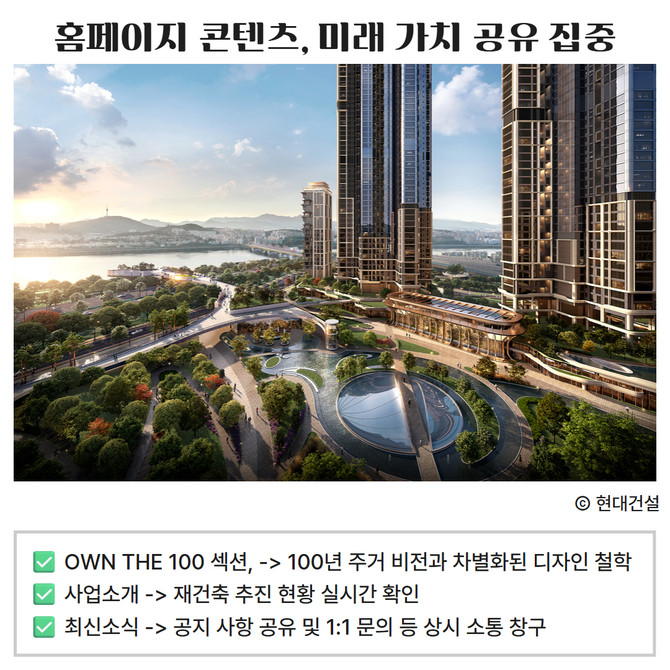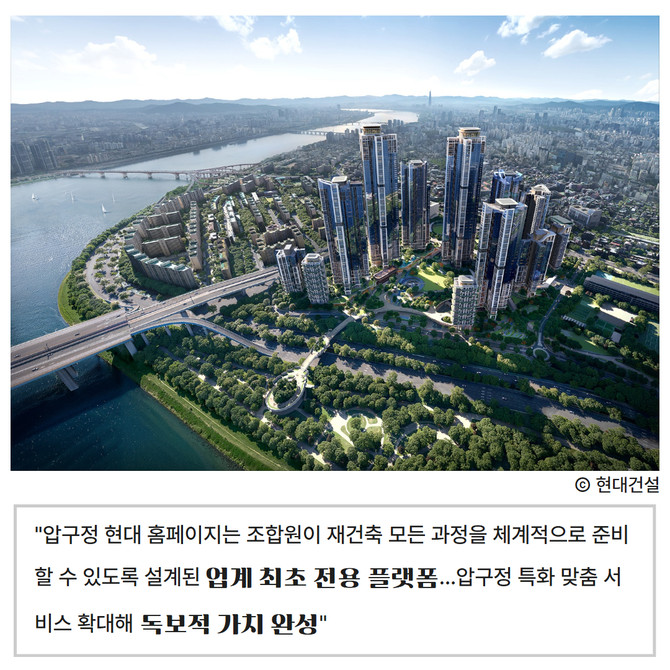 [프라임경제] 현대건설(000720)은 압구정2구역 재건축 사업의 효율적 추진과 조합원 소통 강화를 위해 전용 플랫폼 '압구정 현대' 홈페이지를 구축하고, 시공사 계약 체결과 함께 오픈할 계획이라고 11일 밝혔다.