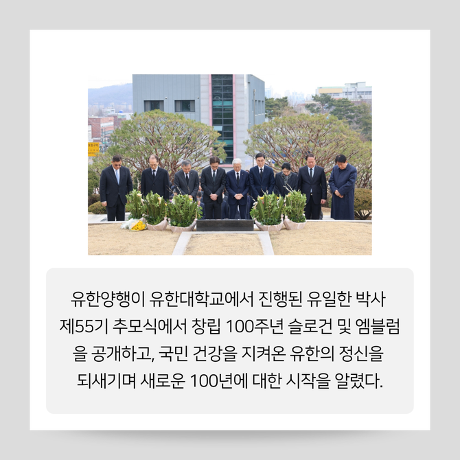 [프라임경제] 유한양행(000100)이 유한대학교에서 진행된 유일한 박사 제55기 추모식에서 창립 100주년 슬로건 및 엠블럼을 공개하고, 국민 건강을 지켜온 유한의 정신을 되새기며 새로운 100년에 대한 시작을 알렸다.