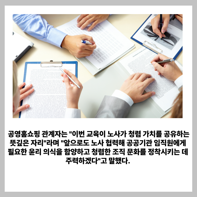[프라임경제] 공영홈쇼핑이 노동조합과 손잡고 조직 내 청렴 문화 확산에 나섰다. 공영홈쇼핑은 임직원 청렴 의식 함양 및 윤리 의식 제고를 위한 '청렴 현장 탐방 교육'을 실시했다고 11일 밝혔다.