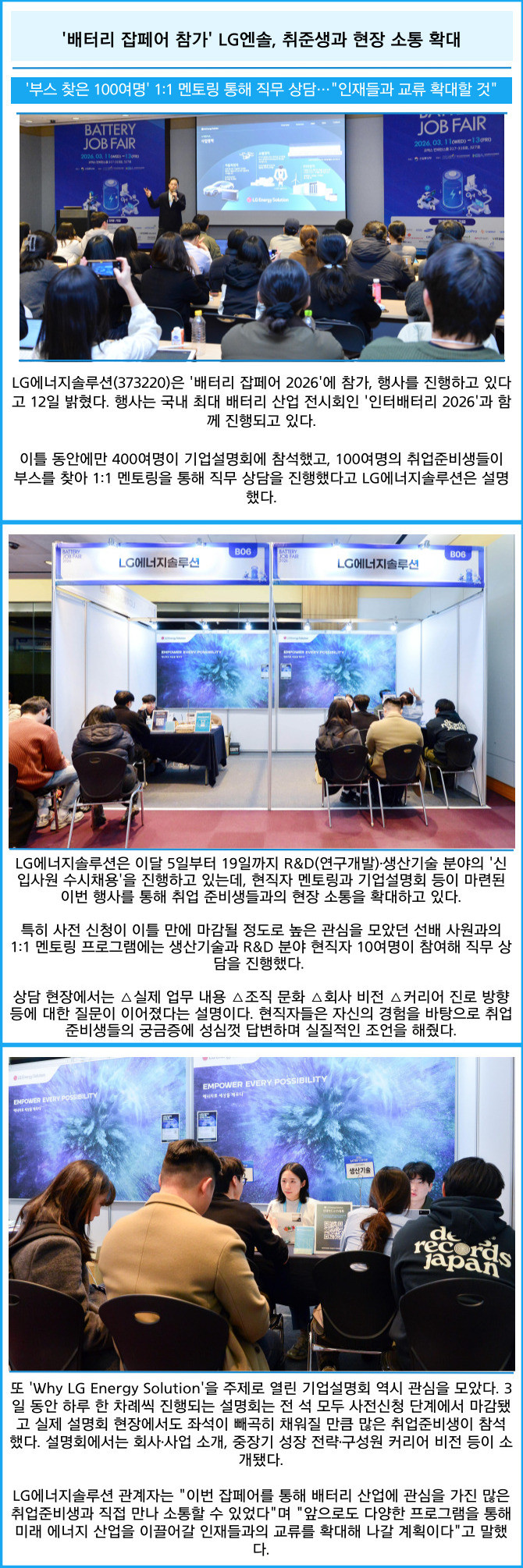 [프라임경제] LG에너지솔루션(373220)은 '배터리 잡페어 2026'에 참가, 행사를 진행하고 있다고 12일 밝혔다. 행사는 국내 최대 배터리 산업 전시회인 '인터배터리 2026'과 함께 진행되고 있다.