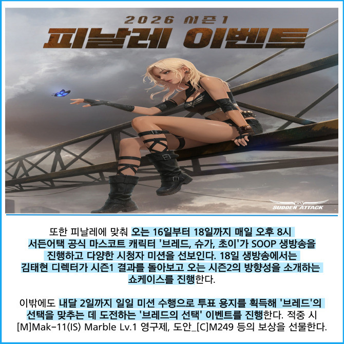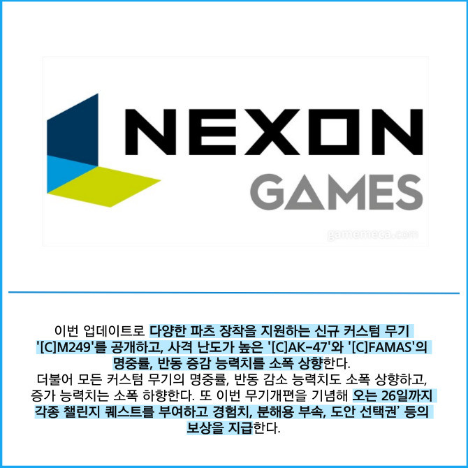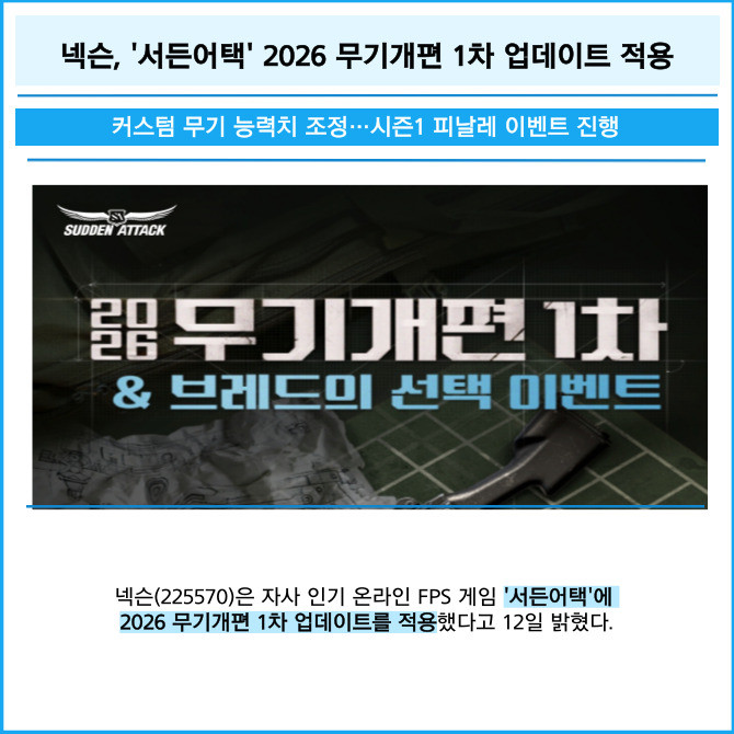 [프라임경제] 넥슨(225570)은 자사 인기 온라인 FPS 게임 '서든어택'에 2026 무기개편 1차 업데이트를 적용했다고 12일 밝혔다.