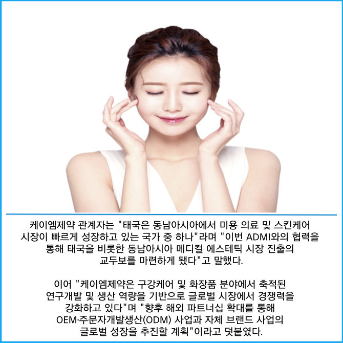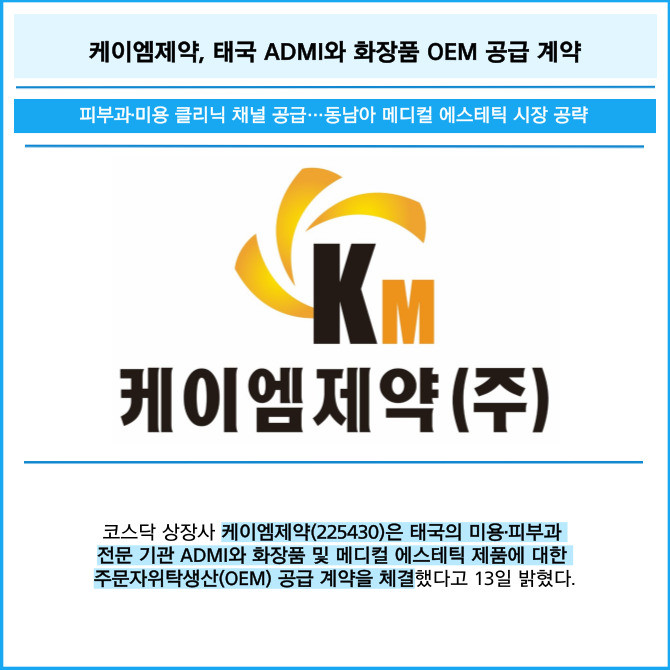 [프라임경제] 코스닥 상장사 케이엠제약(225430)은 태국의 미용·피부과 전문 기관 ADMI와 화장품 및 메디컬 에스테틱 제품에 대한 주문자위탁생산(OEM) 공급 계약을 체결했다고 13일 밝혔다.
