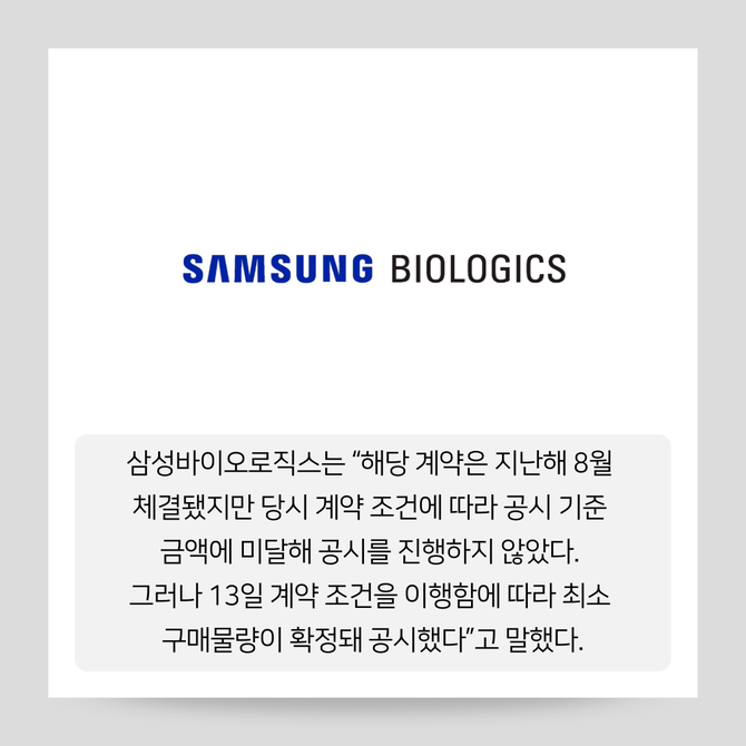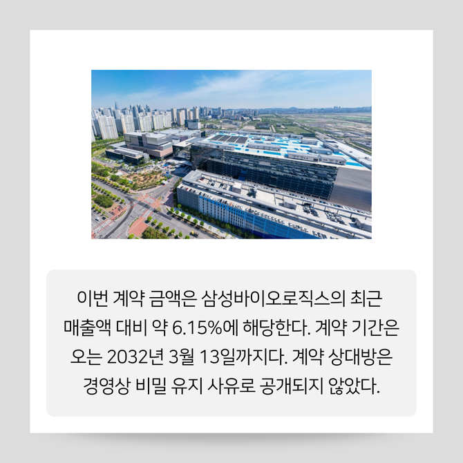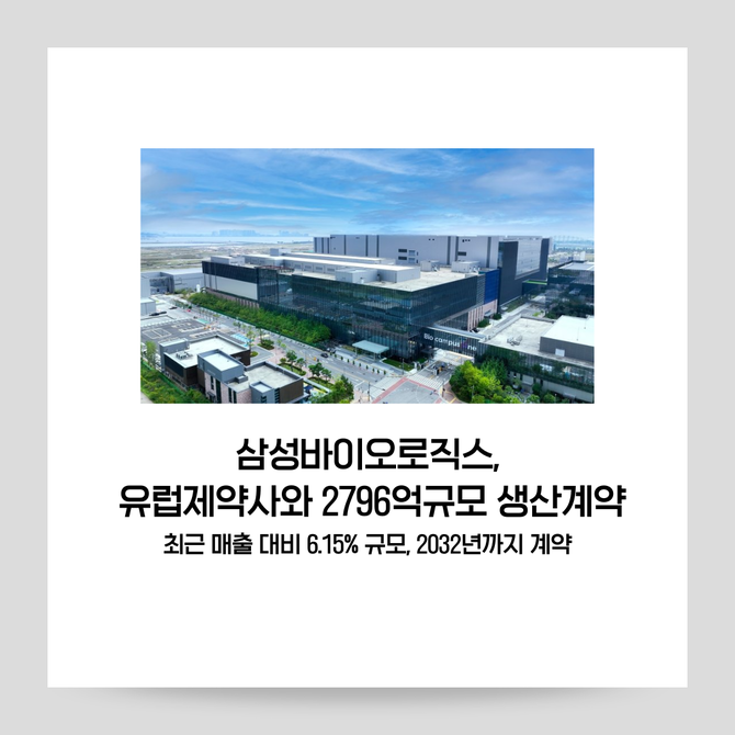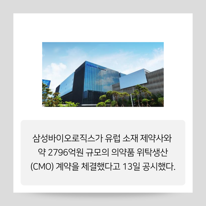 [프라임경제] 삼성바이오로직스(207940)가 유럽 소재 제약사와 약 2800억원 규모의 의약품 위탁생산계약을 체결했다고 13일 공시했다.