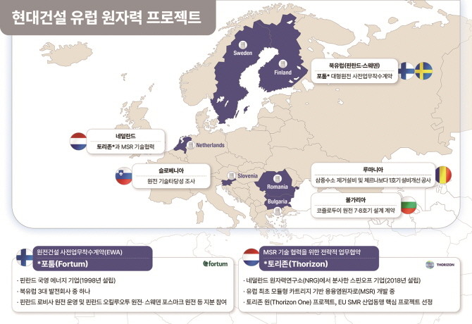 현대건설과 웨스팅하우스는 앞서 불가리아 코즐로두이 대형원전 설계 계약을 체결한 바 있다. 이어 슬로베니아 신규 원전 프로젝트 기술타당성 조사, 그리고 핀란드 국영 에너지기업 포툼(Fortum)과의 사전업무착수계약(EWA) 등을 통해 유럽 내 협력 기반을 넓히고 있다.