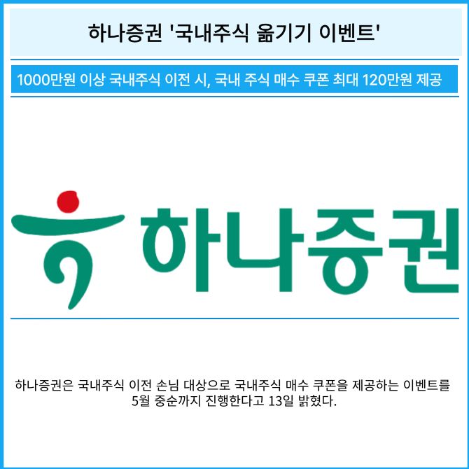 [프라임경제] 하나증권은 국내주식 이전 손님 대상으로 국내주식 매수 쿠폰을 제공하는 이벤트를 5월 중순까지 진행한다고 13일 밝혔다.