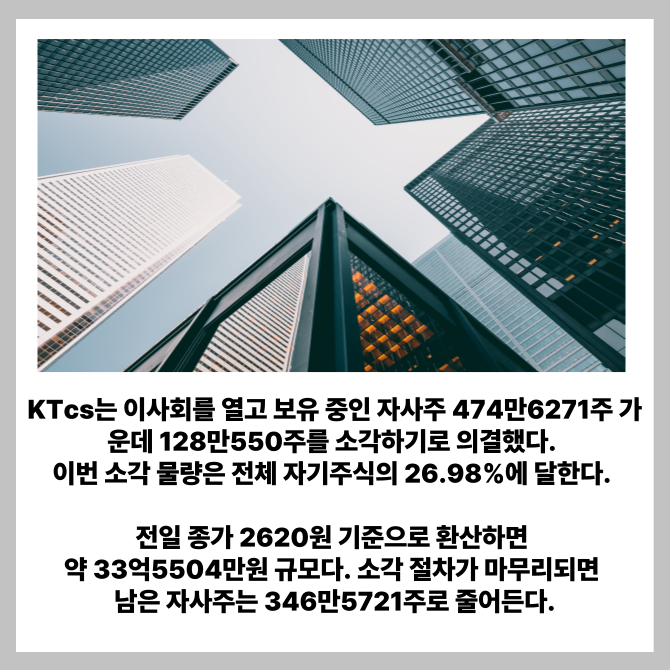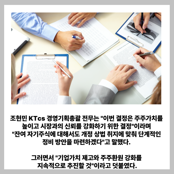 [프라임경제] KTcs(대표 지정용, 058850)는 기업가치 상승과 주주 권익 보호를 위해 대규모 자기주식 소각을 단행한다고 13일 밝혔다.