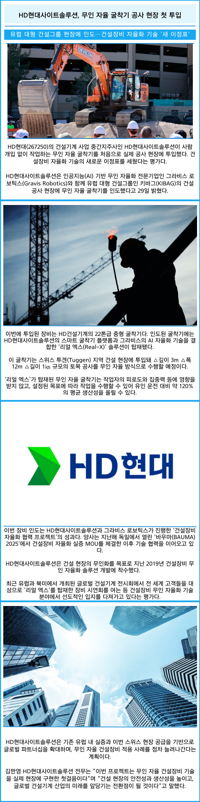 [프라임경제] HD현대(267250)의 건설기계 사업 중간지주사인 HD현대사이트솔루션이 사람 개입 없이 작업하는 무인 자율 굴착기를 처음으로 실제 공사 현장에 투입했다. 건설장비 자율화 기술의 새로운 이정표를 세웠다는 평가다.