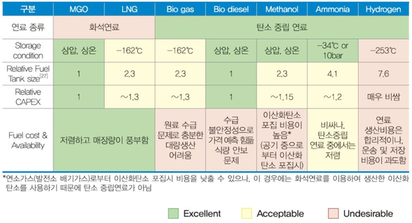 현재 시장이 주목하고 있는 대체연료는 액화천연가스(LNG)이다. 액화천연가스는 곧 시행되는 2020년 황산화물 규제 대응은 물론 미세먼지 및 이산화탄소 저감이 가능해 차세대 청정 선박 연료로 주목 받고 있다. 그러나 이 역시 본질적으로 화석연료로 이산화탄소를 배출하기 때문에 완전한 탈탄소화에는 한계가 있다.