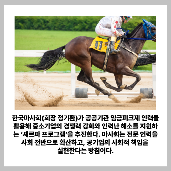 [프라임경제] 한국마사회(회장 정기환)가 공공기관 임금피크제 인력을 활용해 중소기업의 경쟁력 강화와 인력난 해소를 지원하는 ‘셰르파 프로그램’을 추진한다. 마사회는 이를 통해 축적된 전문 인력을 사회 전반으로 확산하고, 공기업의 사회적 책임을 실현한다는 방침이다.