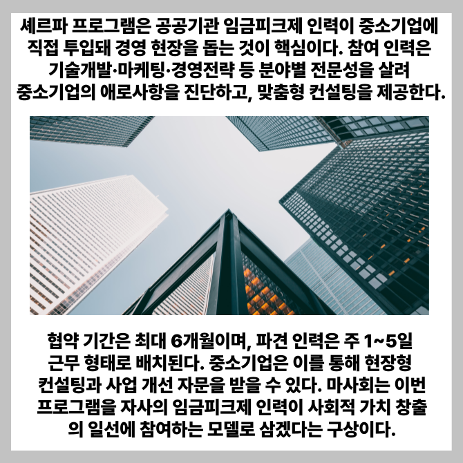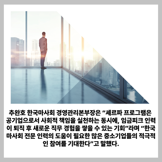 16일 마사회의 셰르파 프로그램은 공공기관 임금피크제 인력이 중소기업에 직접 투입돼 경영 현장을 돕는 것이 핵심이다. 참여 인력은 기술개발·마케팅·경영전략 등 분야별 전문성을 살려 중소기업의 애로사항을 진단하고, 맞춤형 컨설팅을 제공한다.