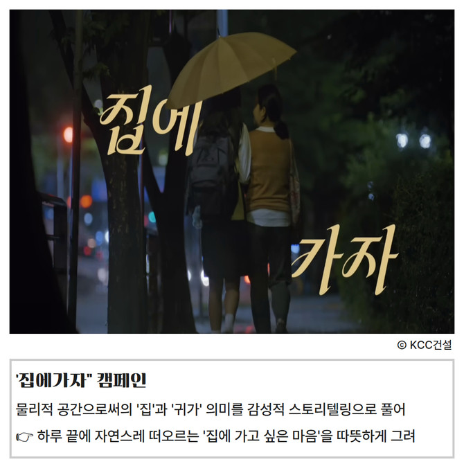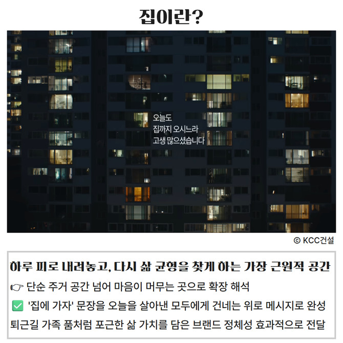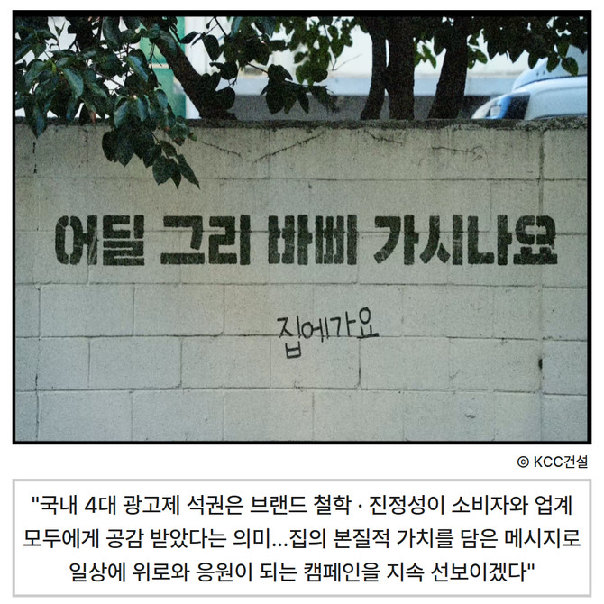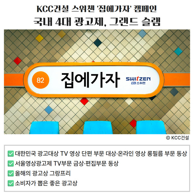 [프라임경제] KCC건설(021320) 주거 브랜드 스위첸이 '소비자가 뽑은 좋은 광고상 디지털 부문' 좋은 광고상을 수상했다. 이에 따라 집에가자 캠페인은 △대한민국 광고대상 TV 영상 단편 부문 대상·온라인 영상 롱필름 부문 동상 △서울영상광고제 TV부문 금상·편집부문 동상 △올해의 광고상 그랑프리 △소비자가 뽑은 좋은 광고상 '그랜드 슬램'을 달성하는 데 성공했다.
