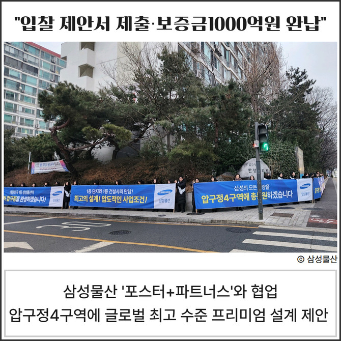 삼성물산(028260) 건설부문(이하 삼성물산)이 30일 압구정4구역 재건축 조합에 입찰 제안서 제출과 보증금 1000억원을 전액 현금으로 완납했다.