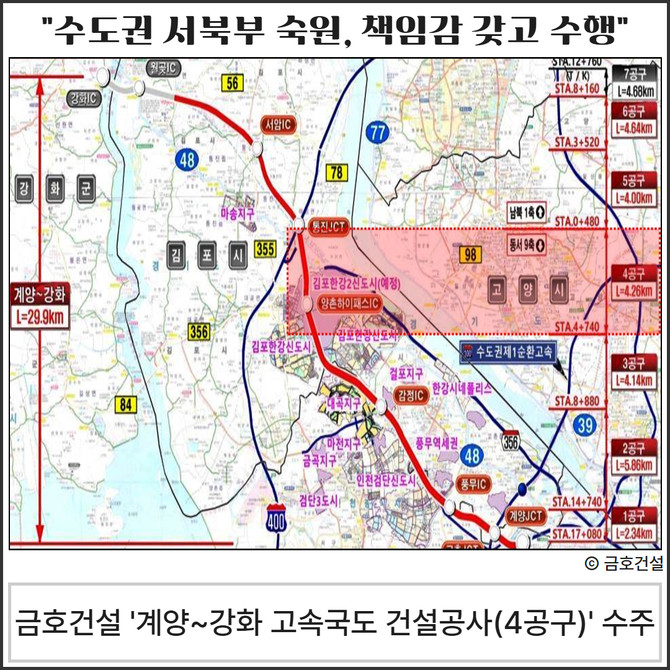 금호건설은 '4공구' 김포 마산동~양촌읍 누산리 구간(4.26㎞)을 맡아 공사를 수행한다. 해당 구간에는 교량 9개소와 양촌하이패스IC 1개소가 포함되며, 왕복 4차선 도로로 건설된다.
