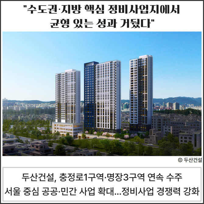 두산건설(011160)이 지난 28일 열린 서울 서대문구 '충정로1구역 공공재개발사업'과 부산 동래구 '명장3구역 재건축사업' 시공사 선정총회에서 연이어 시공사로 선정됐다. 두산건설은 이번 수주를 통해 서울과 부산 핵심 정비사업지에서 성과를 이어가며 정비사업 경쟁력을 입증하는 데 성공했다.