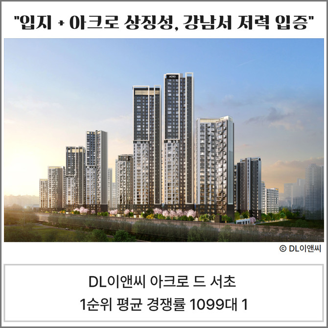 서울 서초동 서초신동아 1·2차 아파트를 재건축한 DL이앤씨(375500) 아크로 드 서초가 1순위 청약에서 평균 경쟁률 1099대 1을 기록하며 '서울 역대 민간분양 최고경쟁률'을 경신했다. 기존 최고 기록은 2024년 10월 분양한 디에이치 에델루이(평균 경쟁률 1025대 1)다.