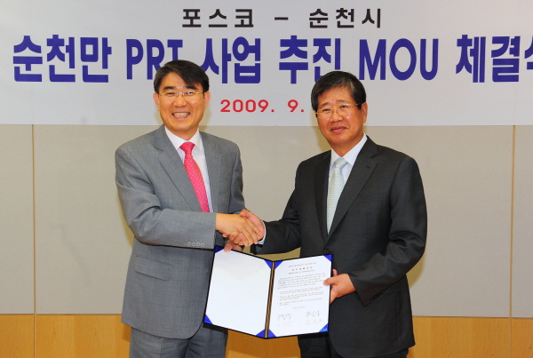 <포스코는 25일 서울 대치동 포스코센터에서 순천시와 소형경전철 건설을 위한 MOU를 체결했다. 오른쪽부터 포스코 이동희 사장, 노관규 순천시장.> |