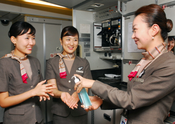 | <아시아나항공 승무원들이 기내에서 신종플루를 예방하기위해 손 세정제를 사용하고있다.> |