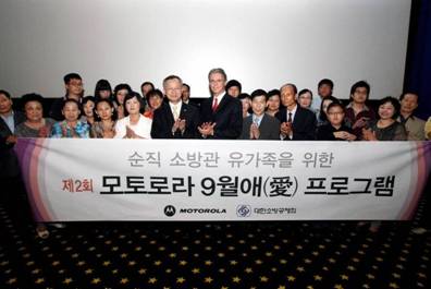 모토로라는 대한소방공제회(이사장 서정식)와 작년에 체결한 ‘소방가족을 위한 모토 9월애(愛) 협약식’에 따라 매년 선정된 순직소방관의 유가족 10가족에게 생활지원비 및 학자금 총 5만 달러를 지원한다. 지원 가족을 선정하는 심의위원회는 대한소방공제회와 소방방재청, 모토로라코리아 대표로 구성되어 있다.