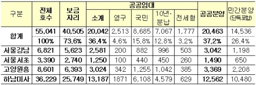 임대주택은 올해부터 공급이 재개되는 영구임대를 비롯해 장기전세와 분양형임대 등 소득수준과 생활여건에 따라 선택할 수 있도록 유형이 다양화됐다. 녹지율 역시 20~24%가 확보됐고 용적률 또한 고도제한이 있는 강남지구(169%)를 제외하고는 210~218%로 계획돼 활용성이 높아졌다.