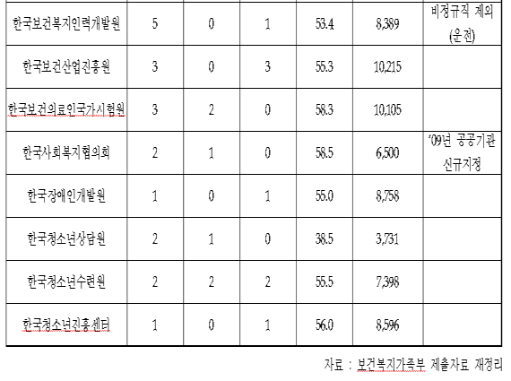 한편, 이직자 33명의 평균연봉은 약 8,142만원이며, 전체 이직자 중 39%인 13명이 9,500만원 이상의 고액연봉을 받고 있는 것으로 밝혀졌다. 한국보건복지인력개발원은 최근 5년간 퇴직공무원 재취업자가 5명으로 산하 기관 중에 가장 많았다.