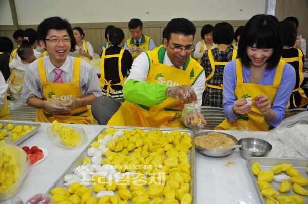 | <아흐메드 에이 수베이 에쓰오일 대표(가운데)를 비롯한 에쓰오일 사회봉사단원들이 강서구 등촌동 일대 독거노인 및 저소득 가정에 배달할 송편을 빚고 있다.> | ||