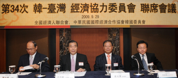| <사진=왼쪽부터 천용추어(陳永綽) 주한 대만 대표처 대표, 왕즈강(王志剛) 한-대만 경제협력위원회 대만측 위원장(대만국제경제합작협회 회장), 강태순 한-대만 경제협력위원회 한국측 위원장(두산 부회장), 이동근 지경부 무역투자 실장> |