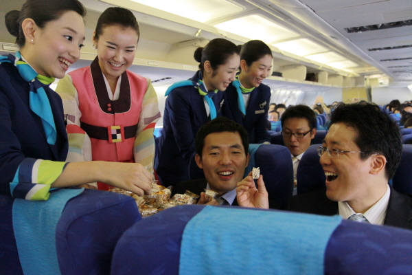 | <에어부산이 추석을 맞아 다양한 고객서비스를 선보인다. 사진은 에어부산 승무원이 오곡강정 서비스를 제공하자 즐거워하는 탑승객들의 모습.> |