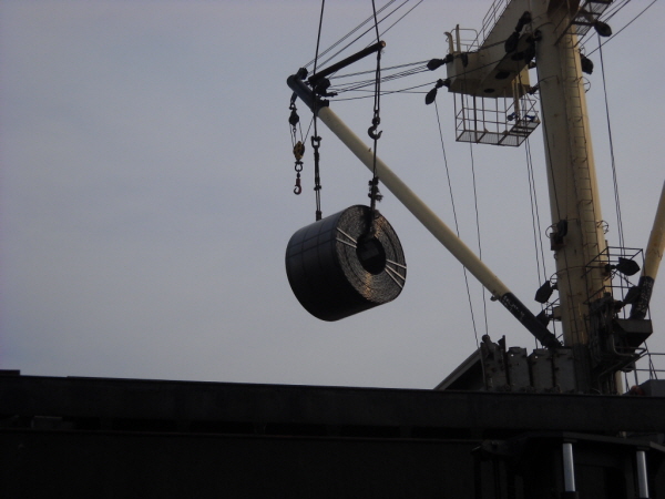 | <사진설명=동부제철 열연강판이 첫 해외수출에 성공했다. 사진은 지난 28일 당진부두에서 선적되고 있고 있는 모습.> | ||