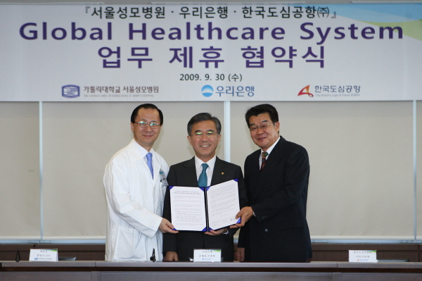 우리은행은 30일 서울성모병원, 한국도심공항(주)와 손잡고 ‘글로벌 헬스 케어 시스템(Global Health Care System)을 제공하는 협약을 맺었다.