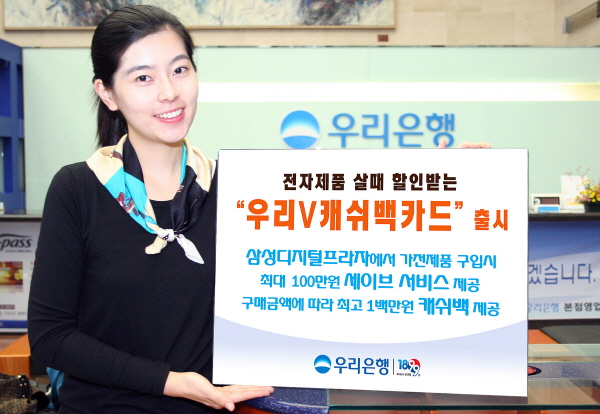 또한, 우리은행은 우리V캐쉬백카드 출시와 삼성전자 창립 40주년을 기념해 11월말까지 삼성디지털프라자에서 100만원 이상 우리카드로 결제하고 30만원 이상 파워세이브 결제를 할 경우 기존 캐쉬백 혜택의 2배를 제공해 최고 100만원의 캐쉬백은 물론 6개월 무이자할부 서비스도 제공한다. 100만원 미만 결제시에는 세이브 결제금액의 3%를 카드 포인트로 적립한다.