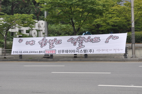 LG전자가 지난달 제출한 가처분신청 내용에 따르면 법원의 1차 결정에 따라 김 대표가 현수막 내용을 교체했지만 현수막에 한겨레, 오마이뉴스, 야후, 다음 등의 블로그가 소개돼 직·간접적으로 LG전자의 명예를 심각하게 훼손시키고 있다는 주장이다.