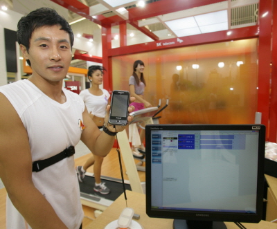 <SKT가 6일 열린 'RFID/USN Korea 2009' 전시회에서 운동 시 심장 박동수 및 폐활량을 무선통신으로 모니터링하는 유비쿼터스 헬스(u-health)기술을 시연하고 있다.> |