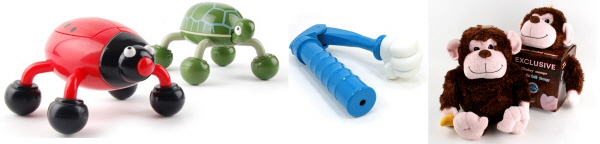 ‘깜찍 미니 안마기’는 머리 부분을 누르면 네 개의 다리가 진동하며 뭉쳐있던 근육을 풀어준다. ‘파워진동 해머안마기’는 해머를 펴주면 자동으로 진동이 시작되고 길쭉한 팔로 손이 잘 닿지 않는 등의 피로까지 풀어줄 수 있다. ‘진동 안마 맛사지인형’은 손에 있는 전원버튼을 누르면 초당 수천 번의 진동으로 시원하게 마사지를 할 수 있으며, 인형 배 부분의 벨크로를 열면 젤팩이 들어있어 냉, 온 찜질도 함께 즐길 수 있다.